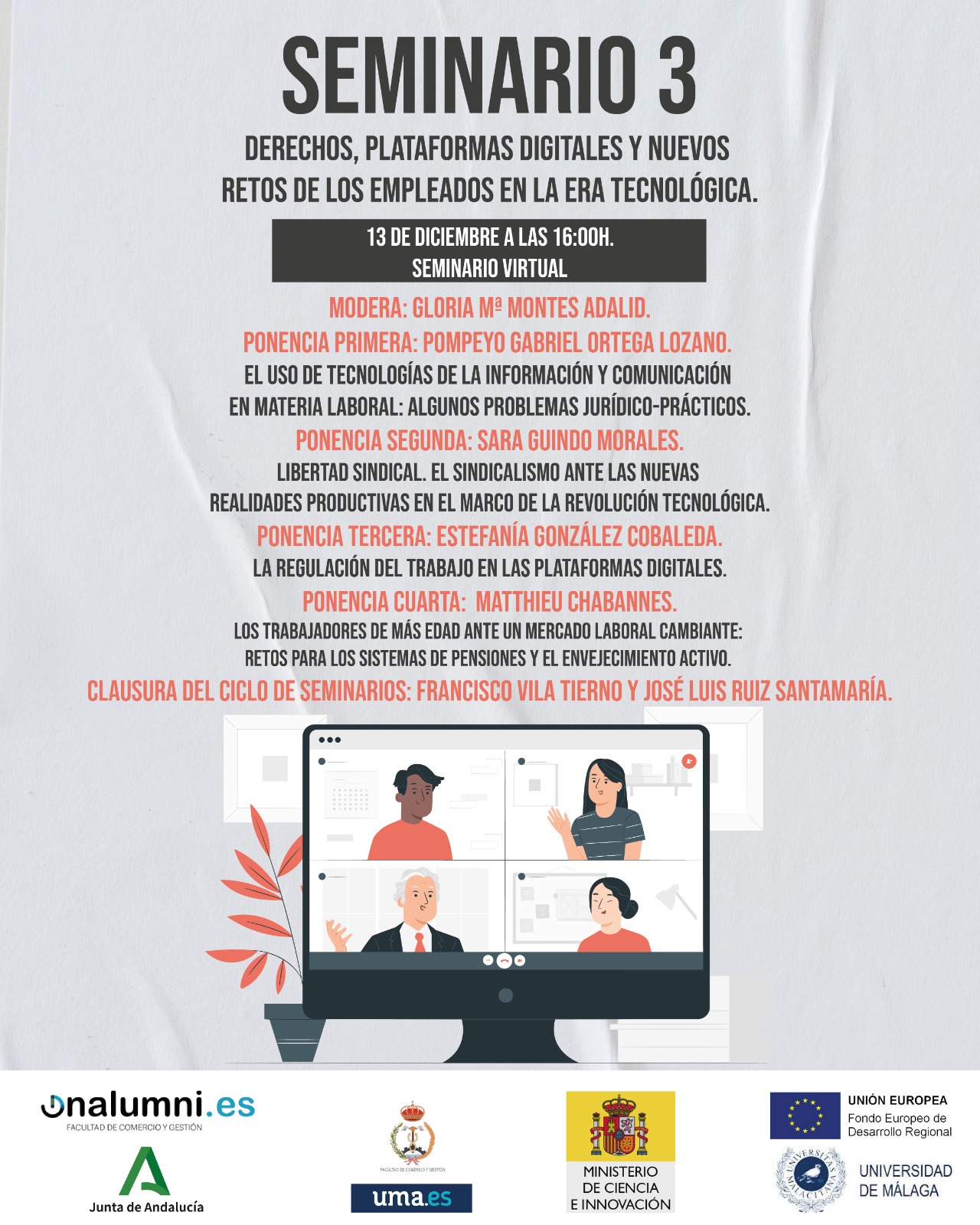 Antes de los 2 días previos al inicio del segundo seminario, los/as interesados/as en presentar una comunicación deberán enviar a gloriamontesadalid@gmail.com sus propuestas, incluyendo un tema, un resumen de hasta 200 palabras y un póster en formato libre (A3, PDF, titulado “Póster – Nombre y Apellidos – Ciclo de Seminarios Empleo”).